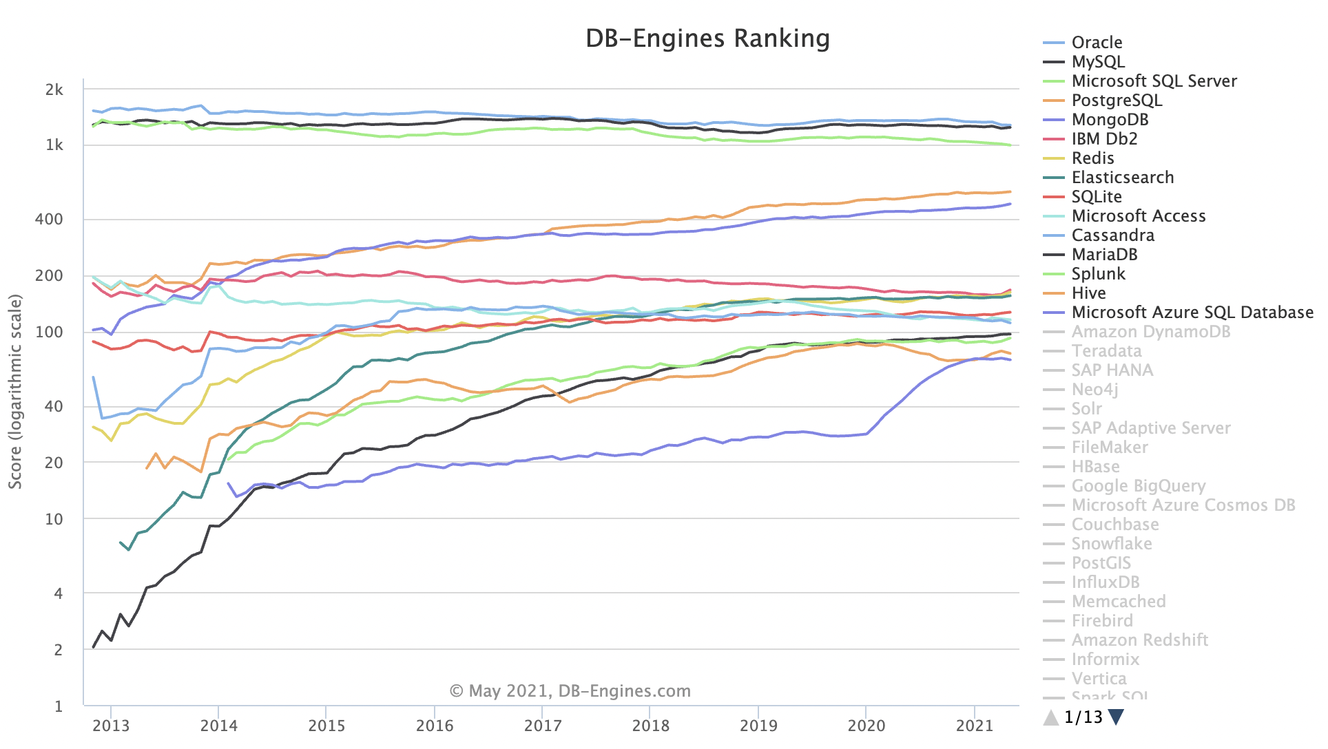 앞서서, 데이터베이스에도 여러 종류가 있고, 데이터베이스를 사용하려는 서비스의 성향에 따라 각기 다른 형태를 선택할 수 있다고 설명했다. 그렇다면, 데이터베이스 시장 상황은 어떨까? 아래는 2013년부터 2021년 5월까지, 상용화된 데이터베이스 사용 실태를 보여주는 통계이다.